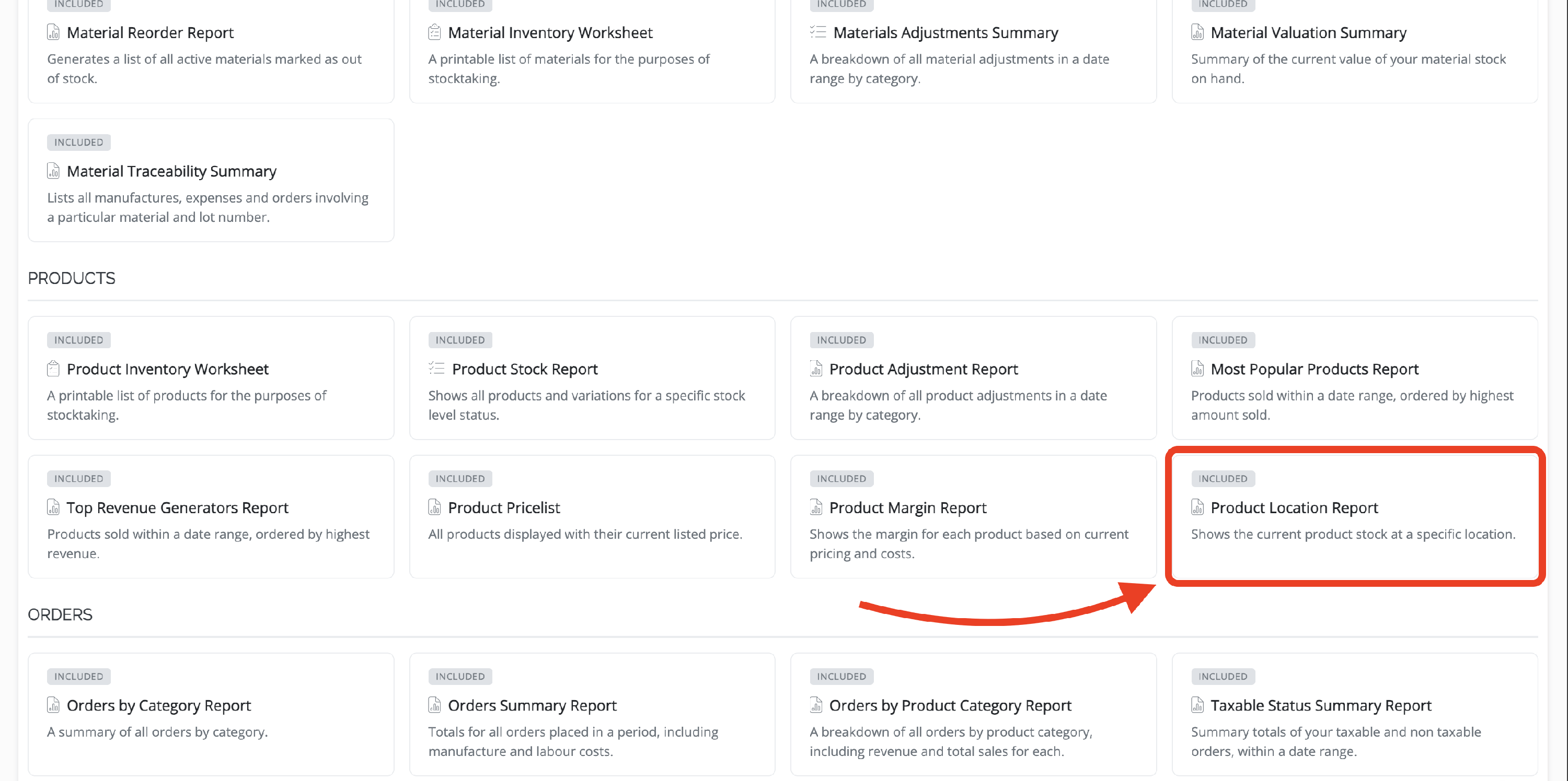 The Product Location Report shows all products for a specific location. This report is useful for checking where your stock is currently physically located.