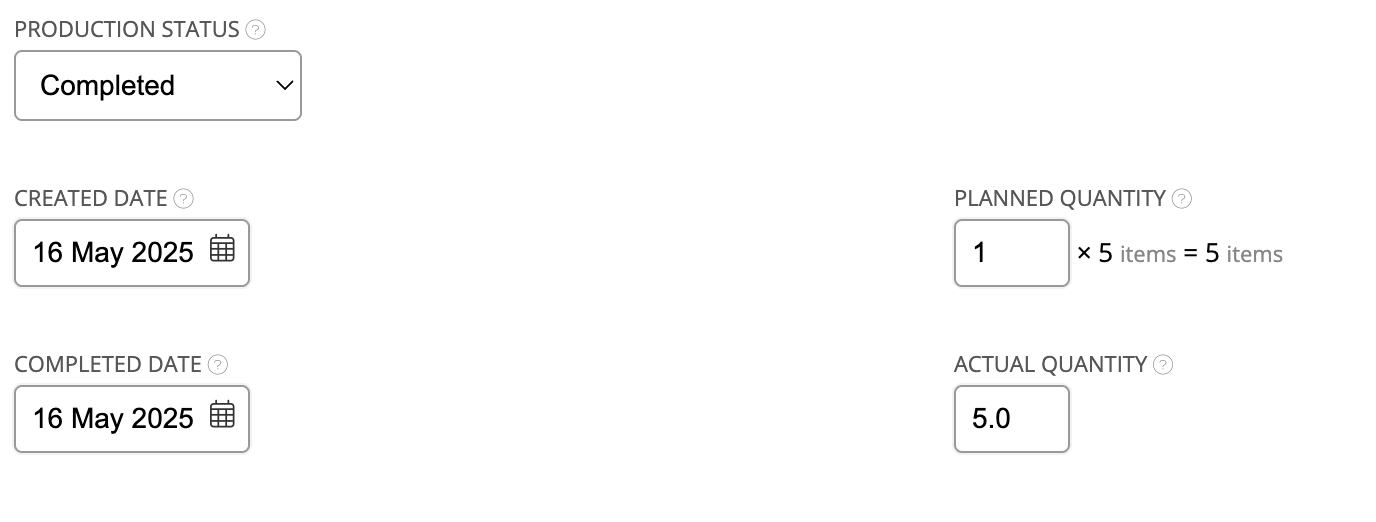 - Completed Date: The day the manufacture was finished and the inventory changes take effect