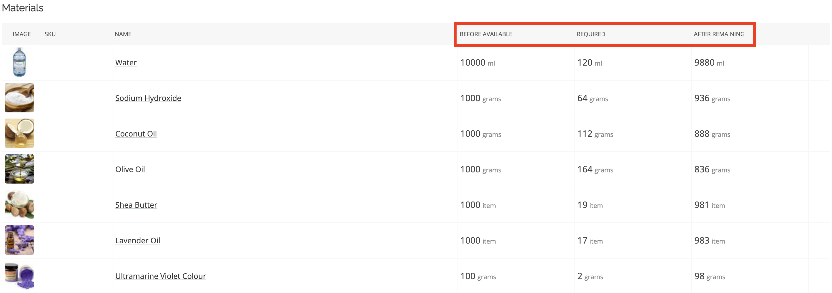 If your product has a recipe, Craftybase will automatically populate this list for you with each inventoriable material, including its name and image for easy identification.