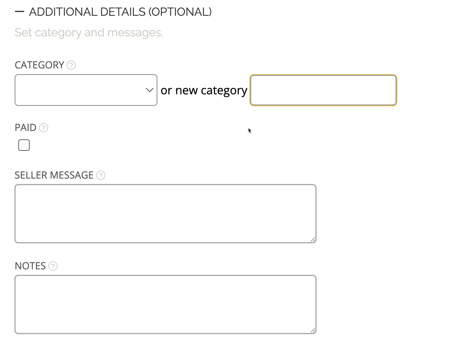 - Category: You can create custom categories and attach a category to your order using the Category field. Either select from your list of existing order categories or add a new one.