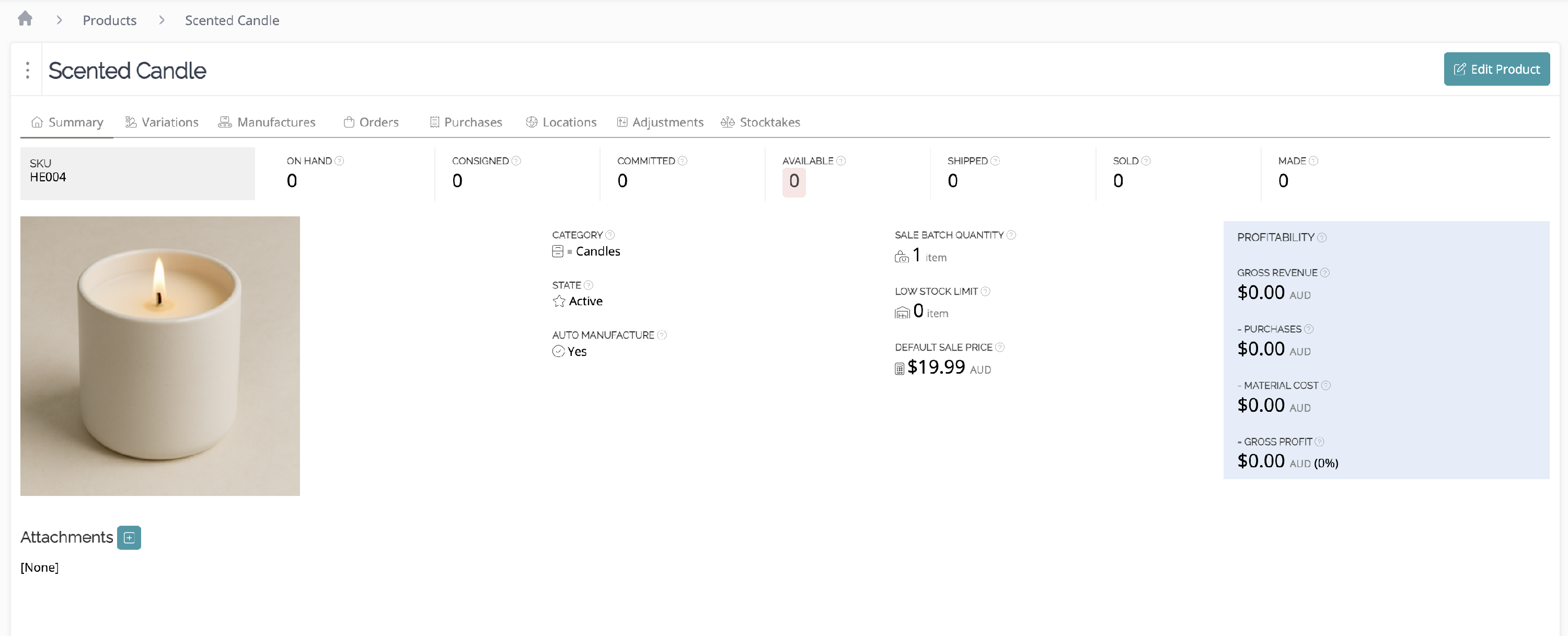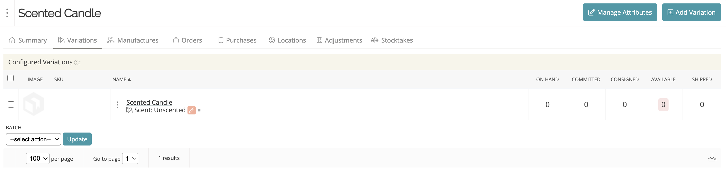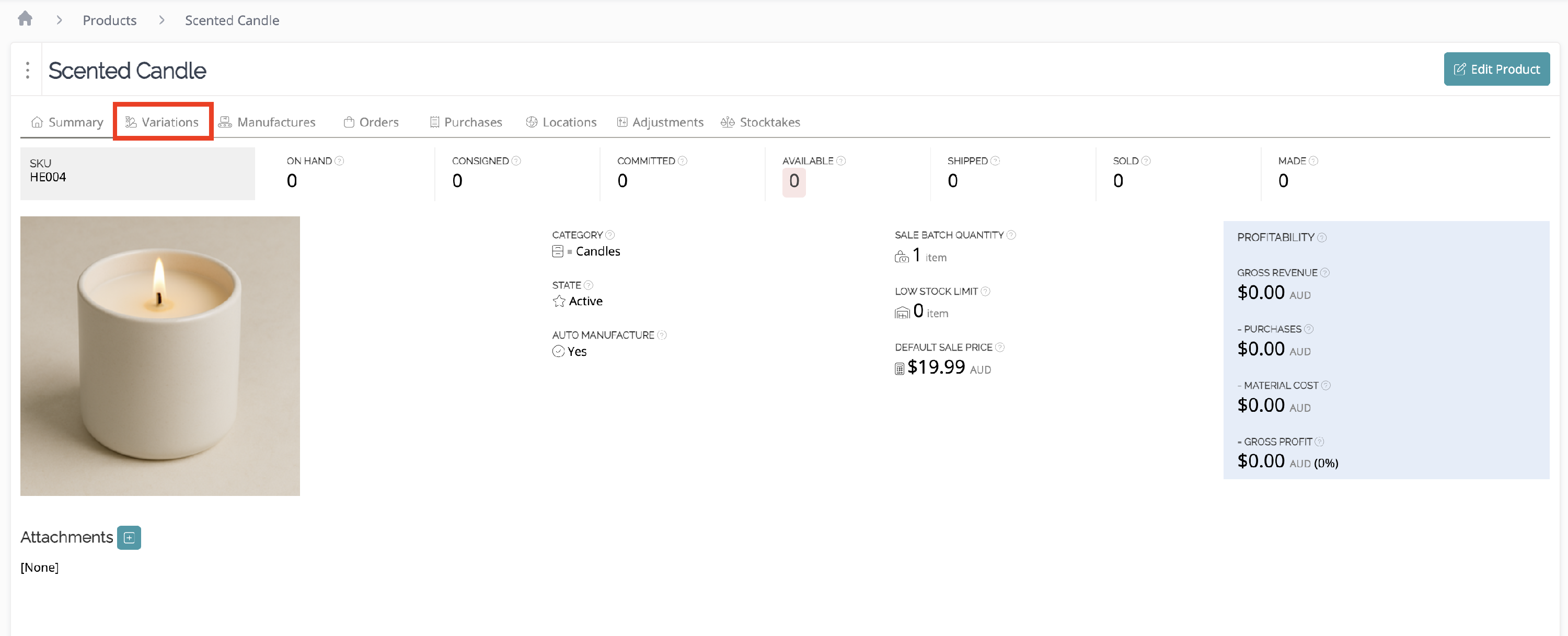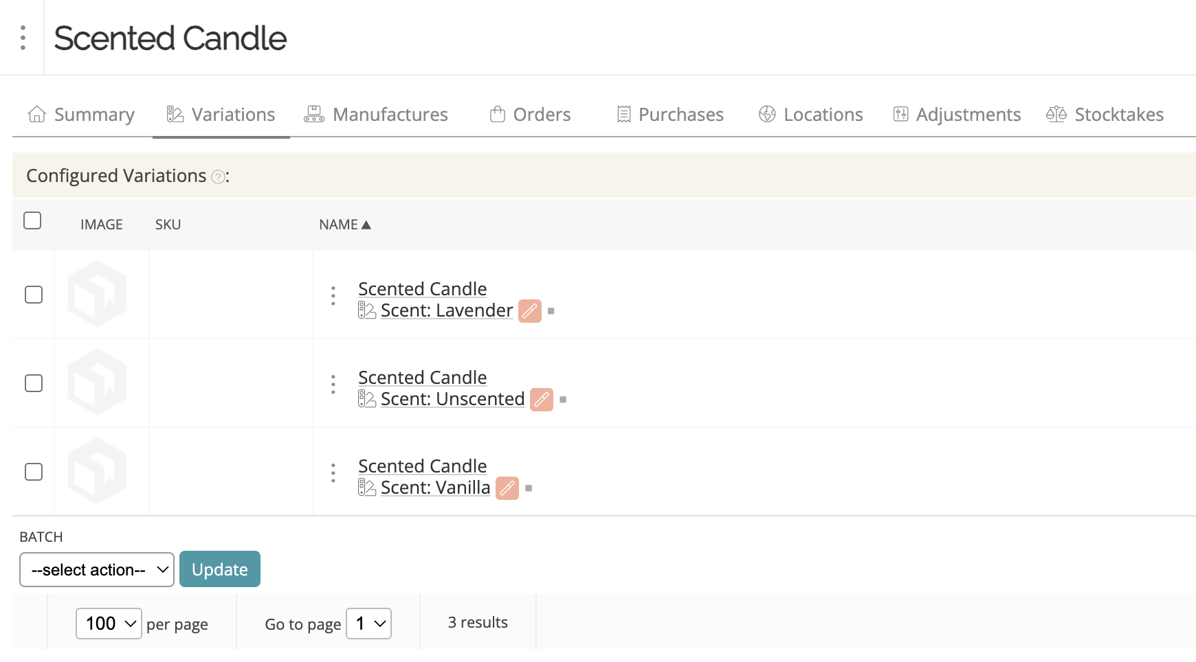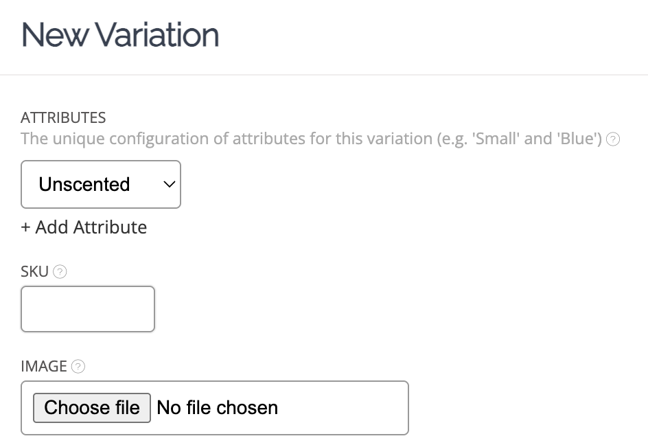 We’ll walk through how to set up variations for a product called “Scented Candle” that comes in three scents: Lavender, Vanilla, and Unscented.