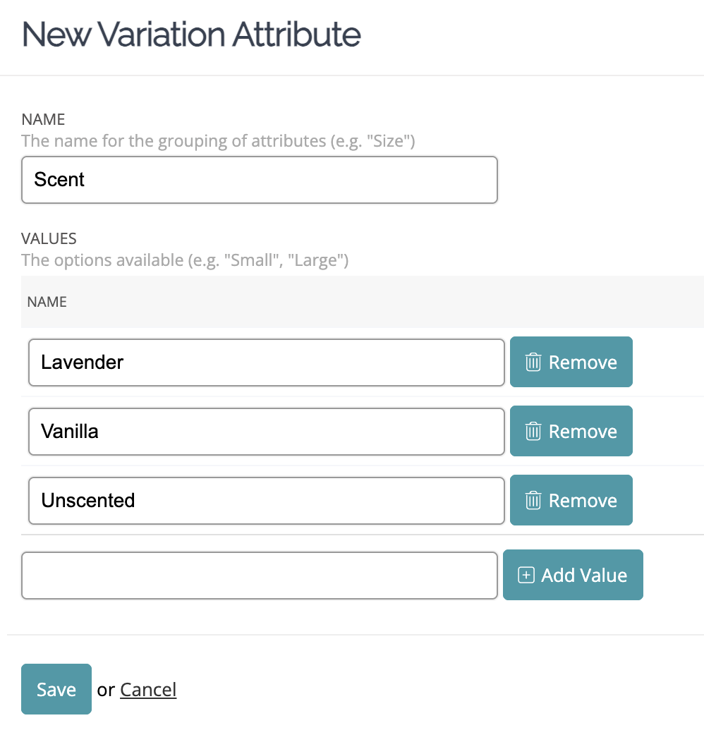 For this tutorial, we’ll create an attribute called Scent with three values: Lavender, Vanilla, and Unscented.