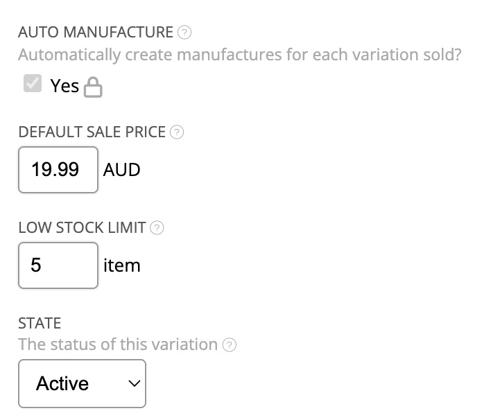 - Auto Manufacture: If Auto Manufacture is on, all new orders for this variation will automatically have a manufacture created. Auto Manufactures will only be created for orders created after this option is switched on.