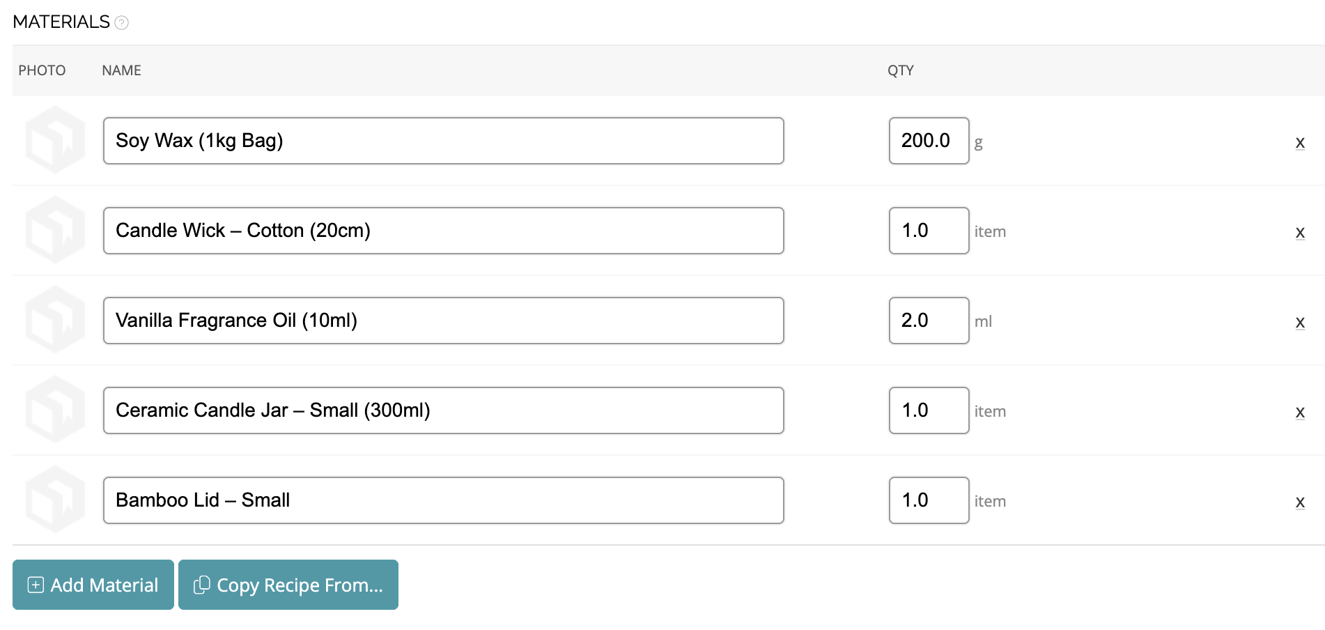 It is a good idea to create the product's recipe by listing any common materials before creating your variation recipes. This way, you won't need to re-add the common materials between variations each time.