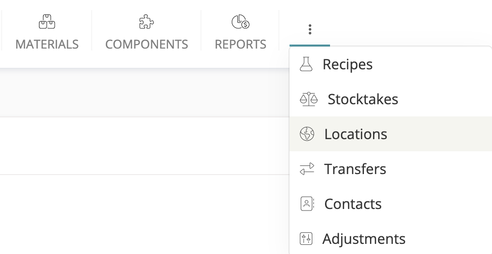 From your Craftybase menu, hover over the ⋮ icon, then click on Locations from the dropdown menu.