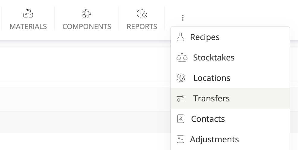 From your Craftybase menu, hover over the ⋮ icon, then click on Transfers from the dropdown menu.