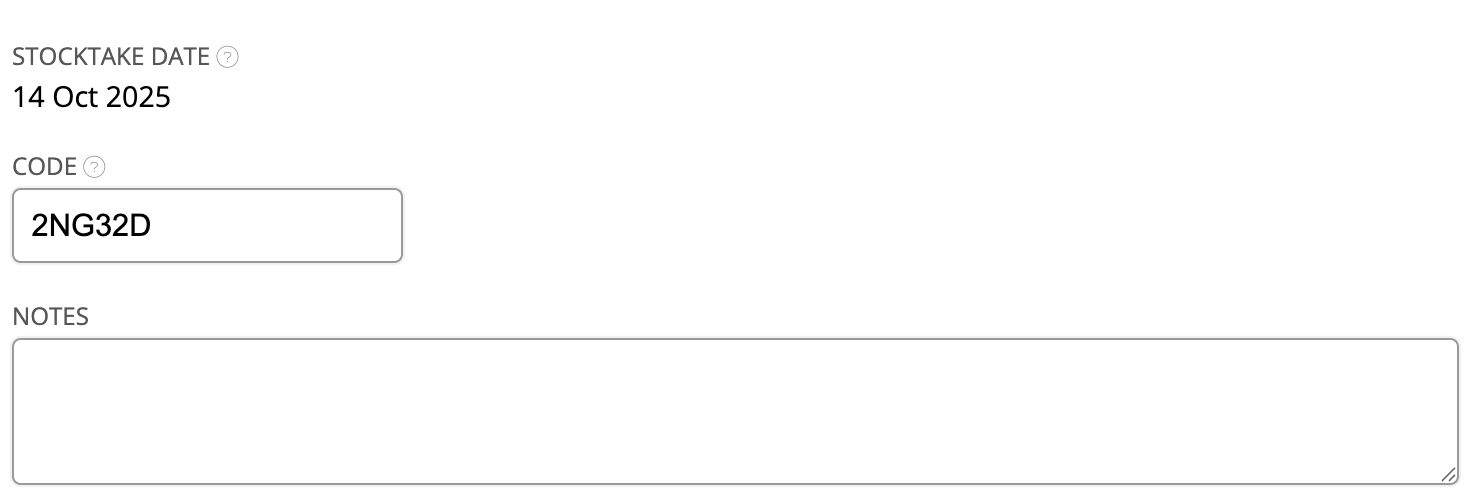 - Code: Use this for any identifier you find useful for tracking your Stocktakes (e.g. “Q2-Audit” or “2025-May-WH1”). If left blank, Craftybase will assign a code automatically.