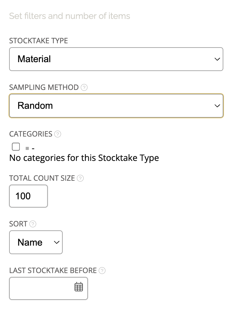 Set filters and number of items: You’ll now configure how you want to select the items for this stocktake. Think of this step as setting the rules for what you'll count and how it's displayed.