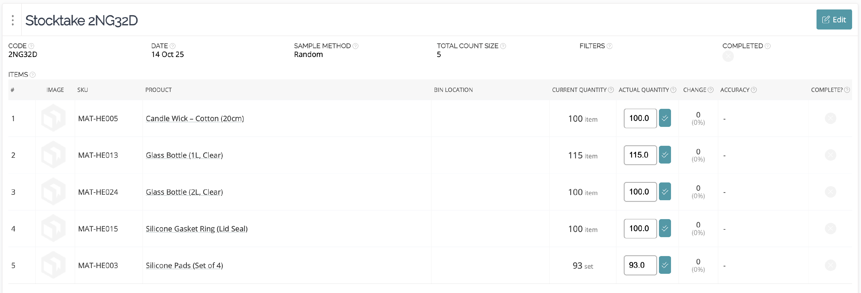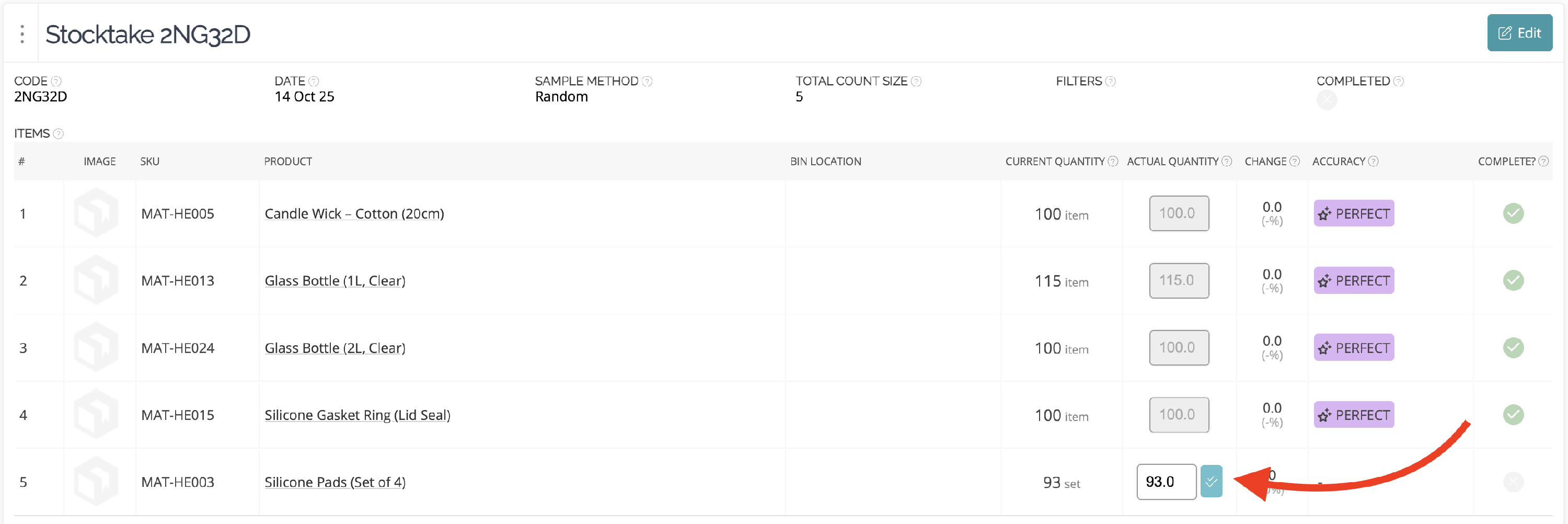 Once you’ve saved all actual quantities using the blue check mark icons, you're ready to complete the stocktake.
