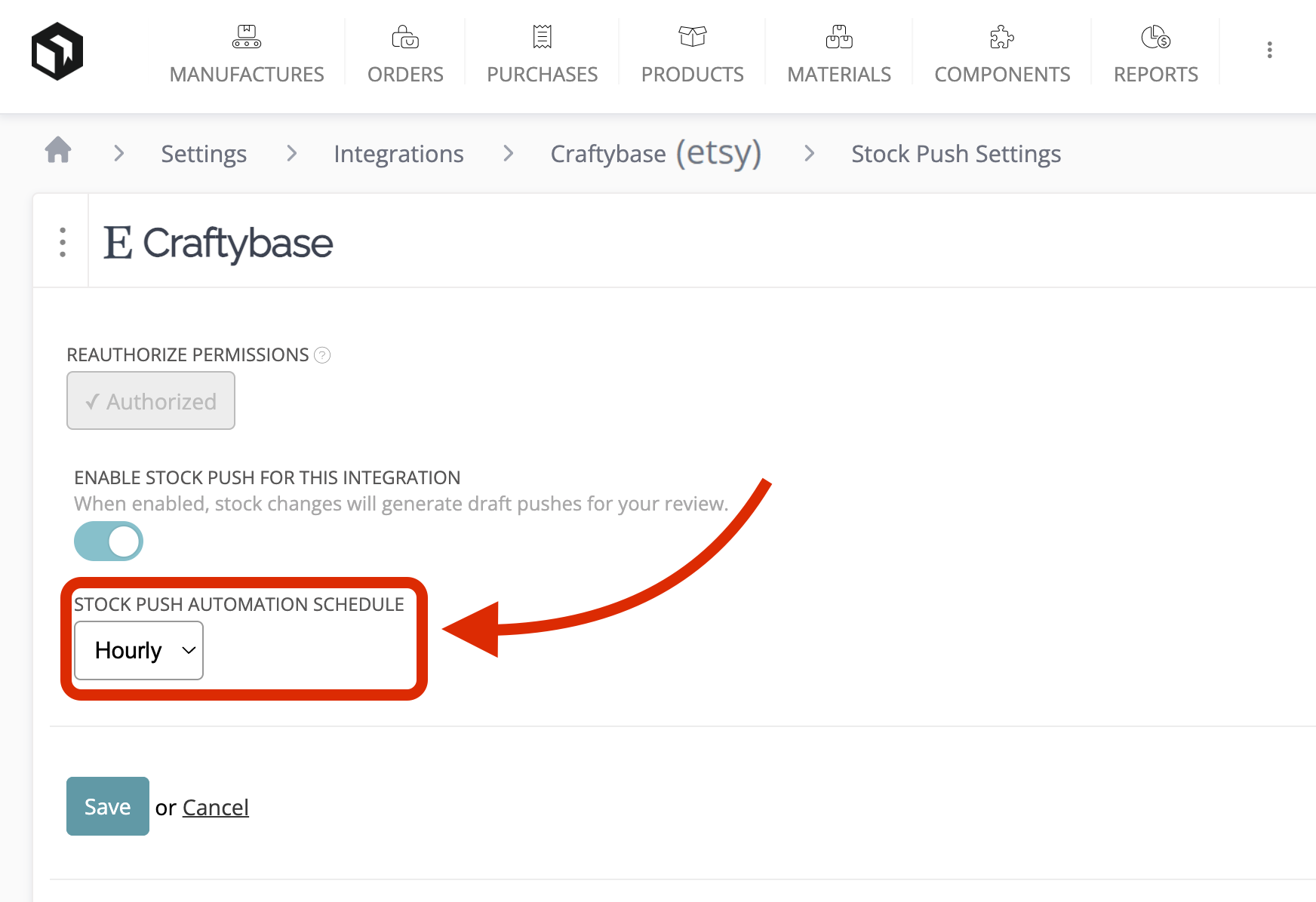 - Under Stock Push Automation Schedule, choose how often you'd like Craftybase to automatically push stock (Off, Daily or Hourly). This can be changed at any time.
