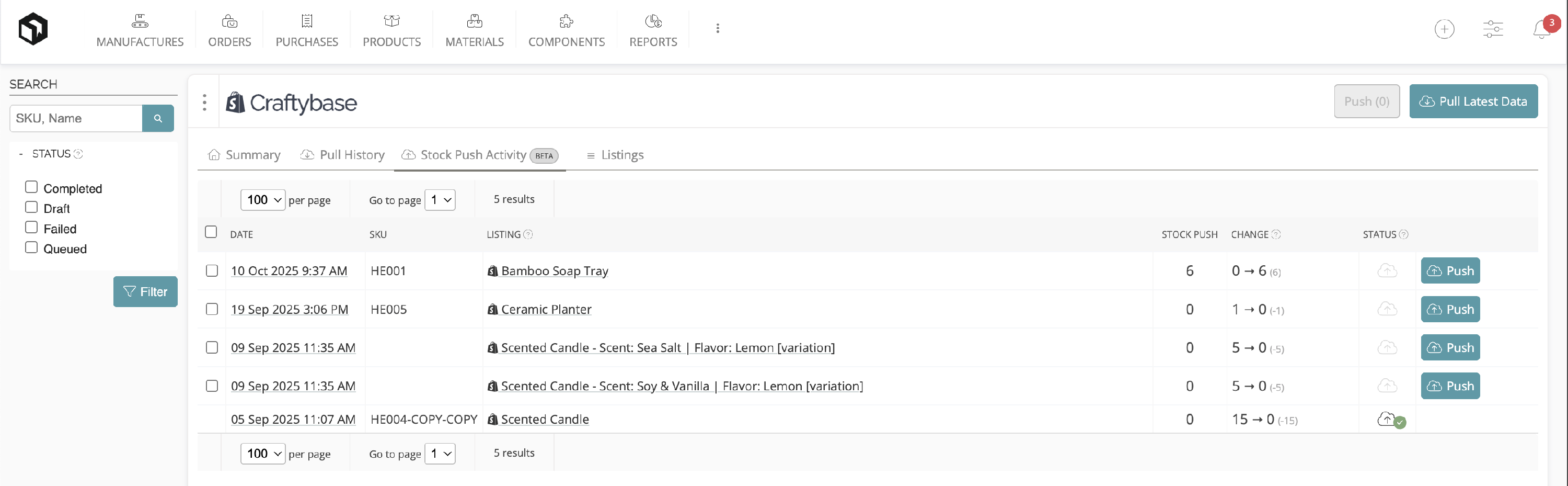 - 10 am: You record a new manufacture for your “Lavender Candle,” increasing stock from 2 to 7 in Craftybase. A draft StockPush is created.