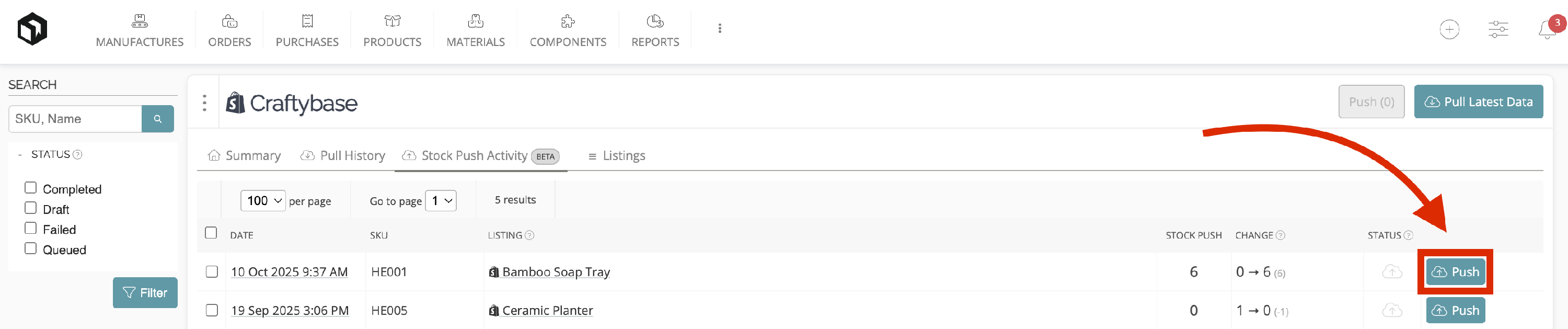 - This will take you to the Stock Push Activity tab, which will display a list of all queued, completed, and failed Stock Pushes for all integrations.