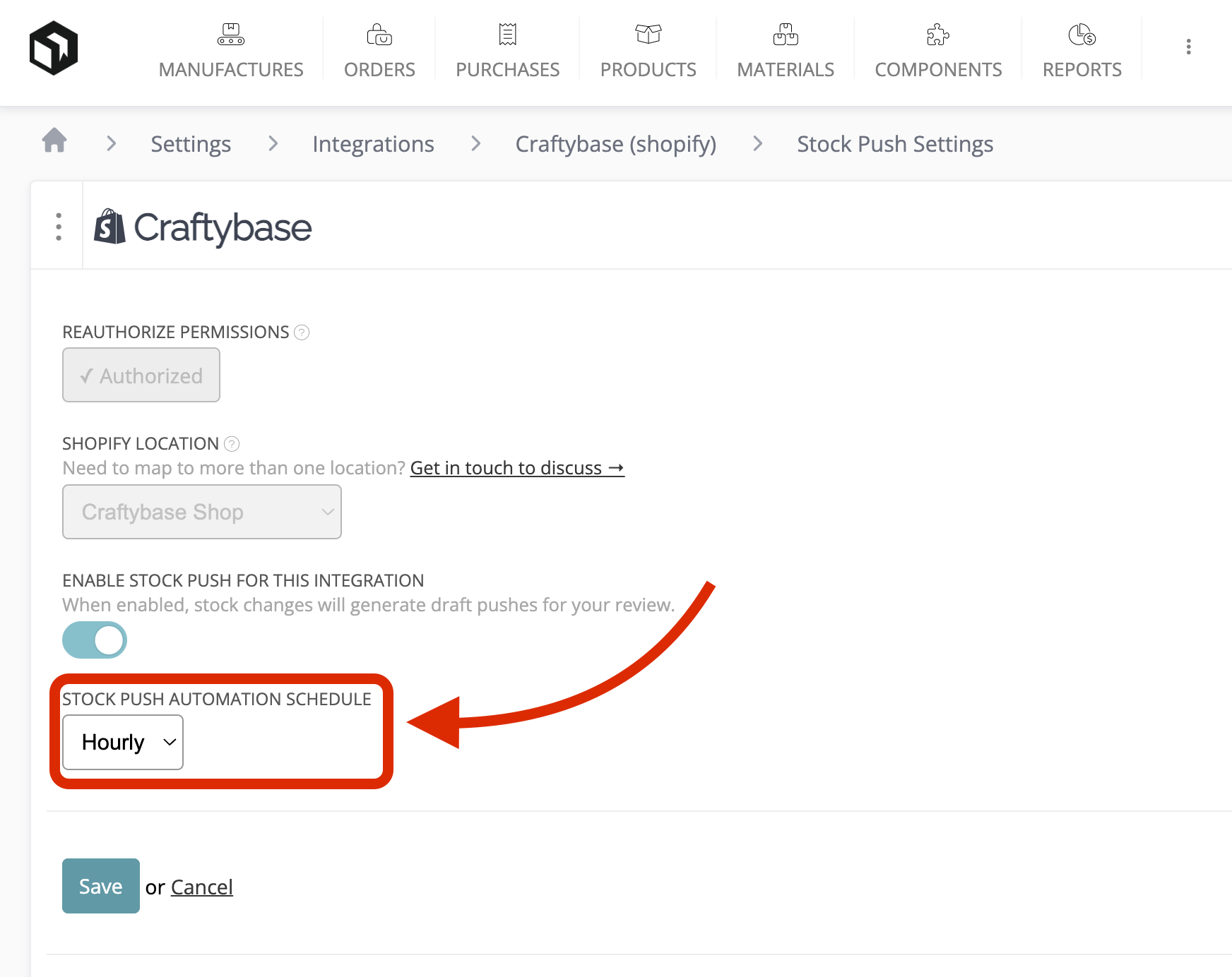 - Under Stock Push Automation Schedule, choose how often you'd like Craftybase to automatically push stock (Off, Daily or Hourly). This can be changed at any time.