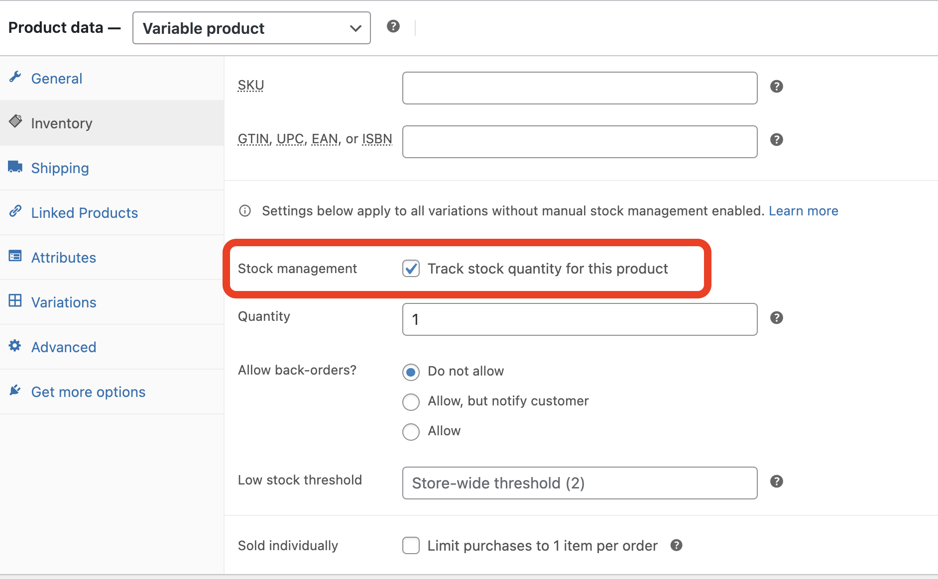 Stock Management: You’ll need to ensure Stock Management is enabled for all of your WooCommerce Products and their associated Variations.