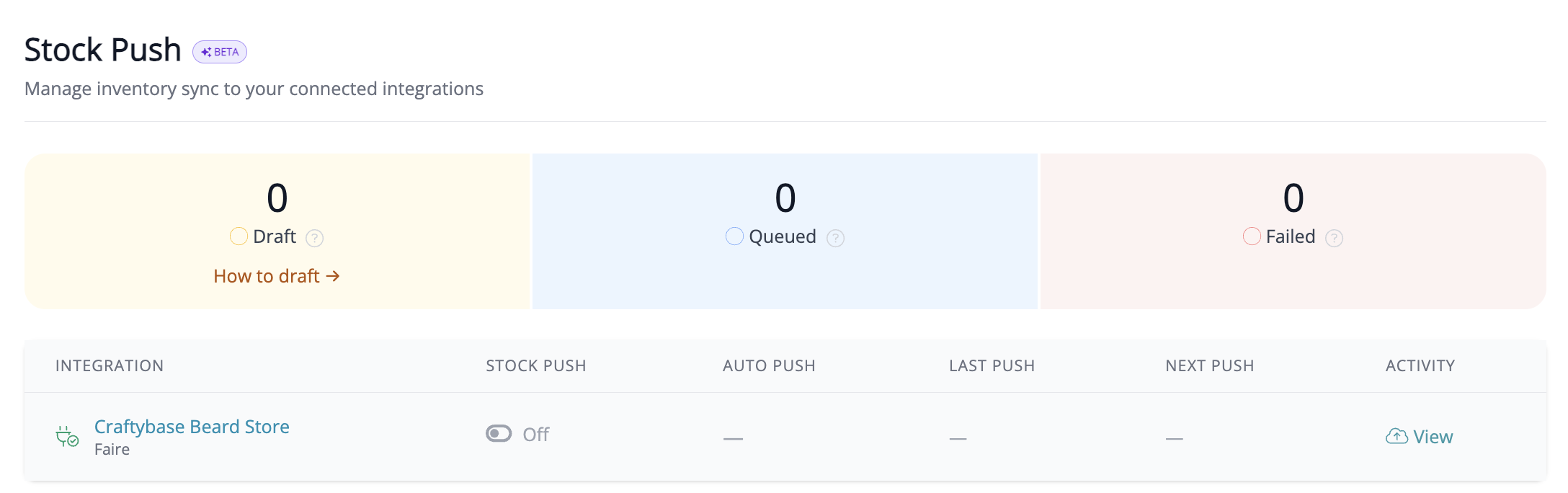 This will take you to the Stock Push tab, where you can find an overview of Draft, Queued, and Failed Stock Pushes across your connected integrations.
