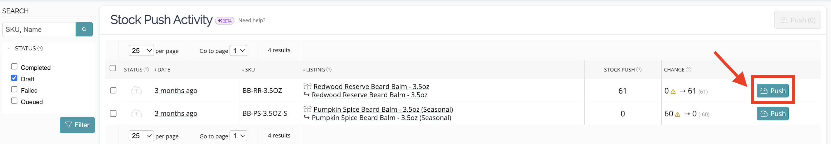 - Go to the Draft tab within the Stock Push page.