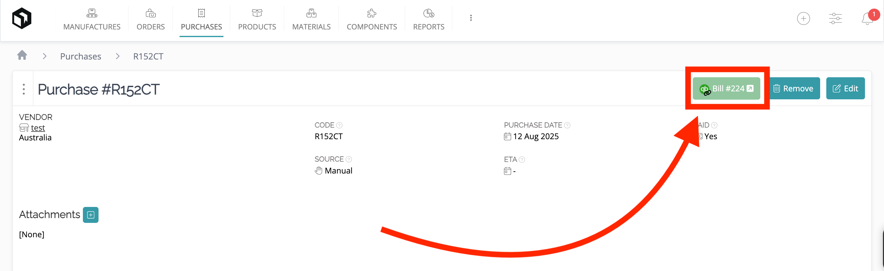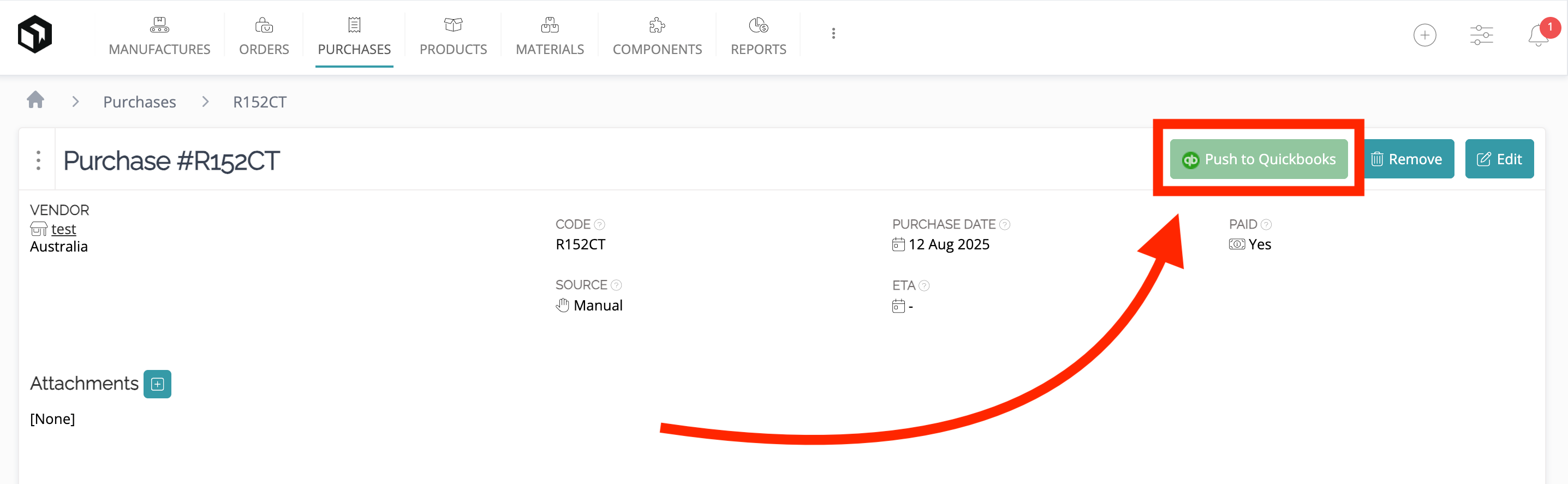 Clicking this button will manually push the Purchase Order details to QuickBooks, creating a corresponding Quickbooks bill. This gives you greater control over when POs are exported to your accounting system.