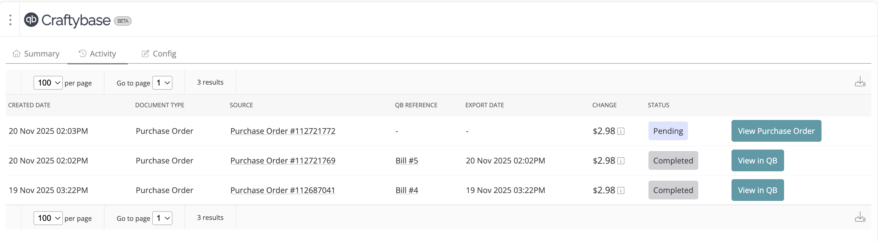 - Pending: The purchase has been created in Craftybase and is waiting to be pushed to Quickbooks
