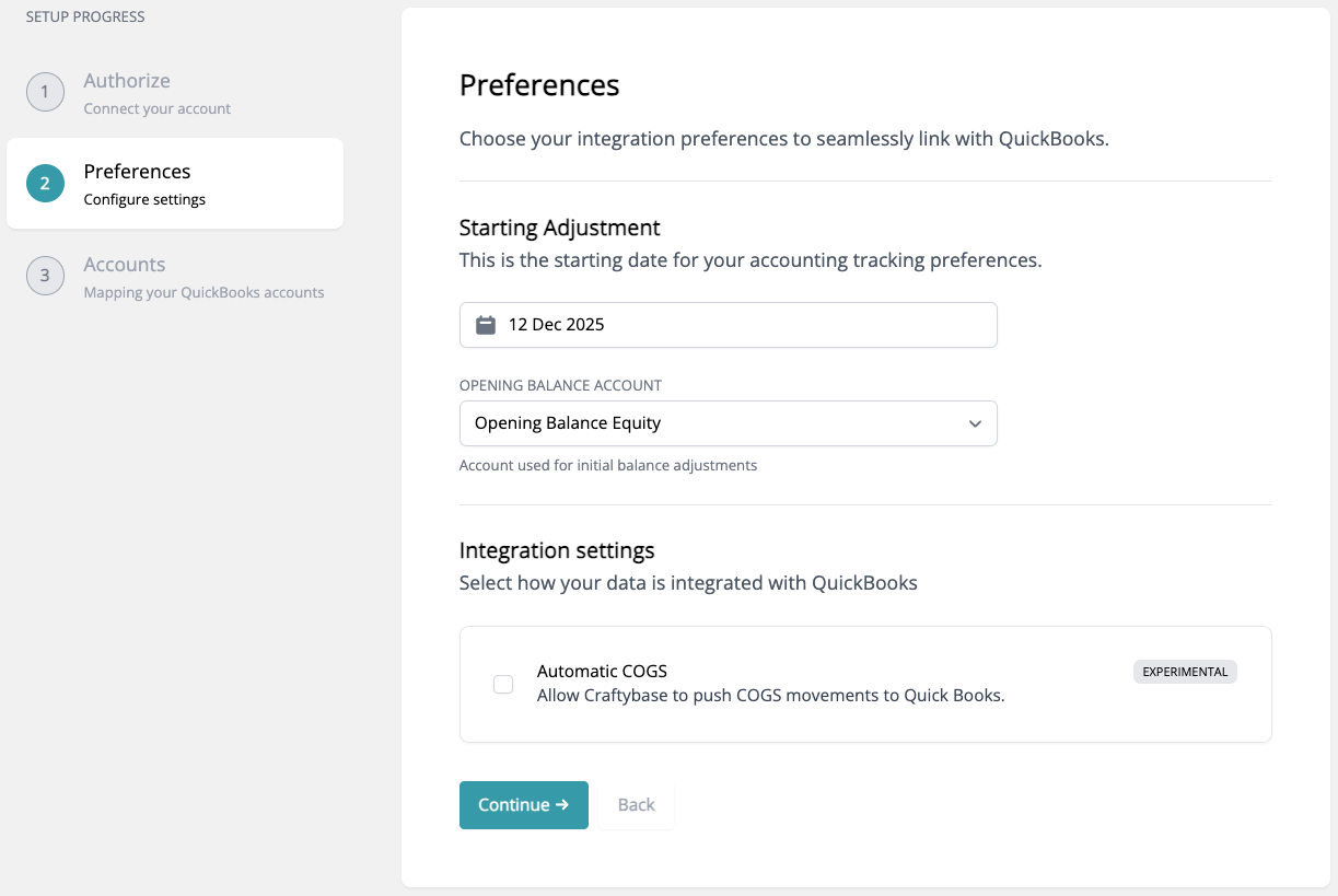 The setup wizard guides you through the steps required to complete your QuickBooks connection with Craftybase: