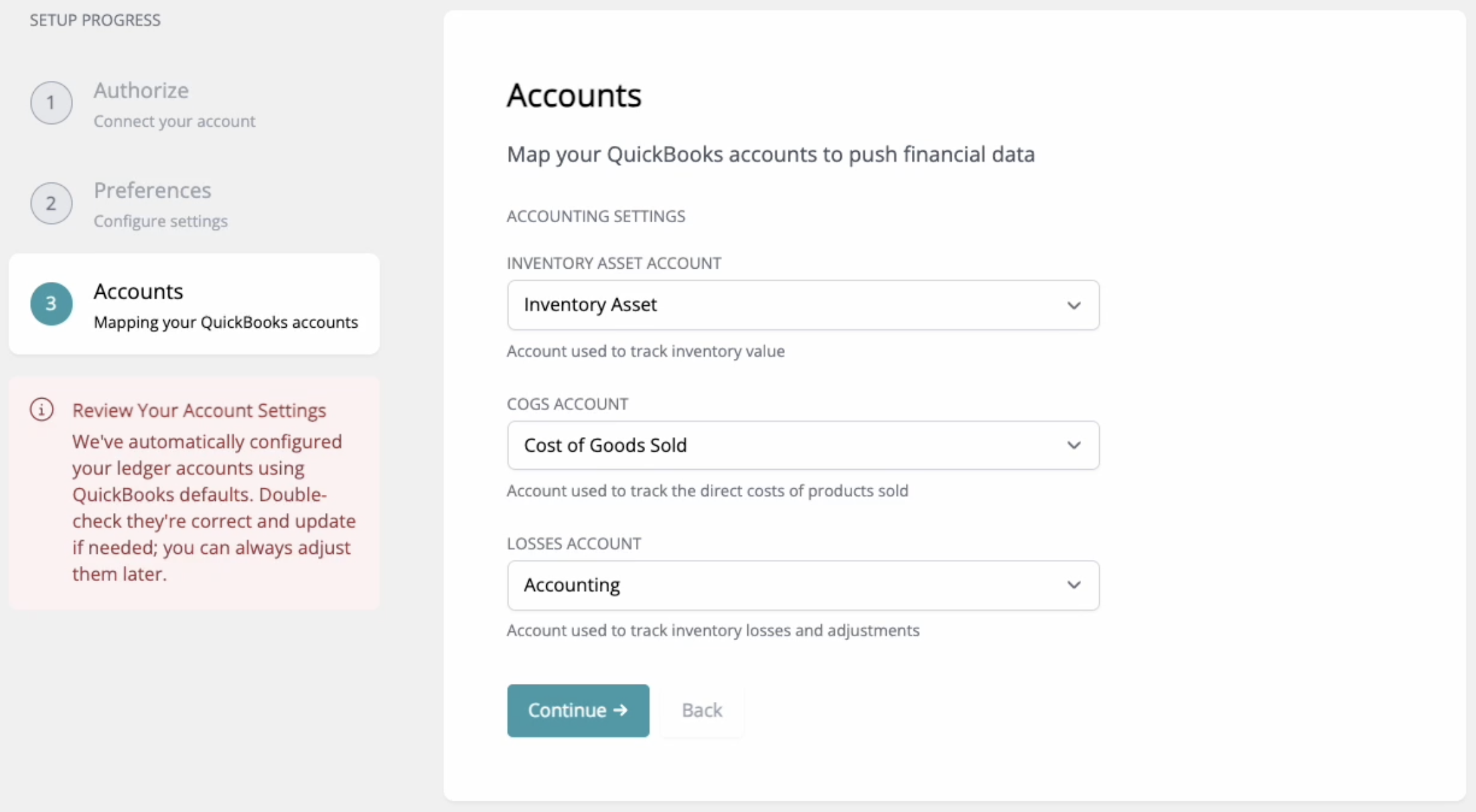 - Inventory Asset Account: Set this to the account used to track your Inventory value. This will default to Inventory Asset if found.