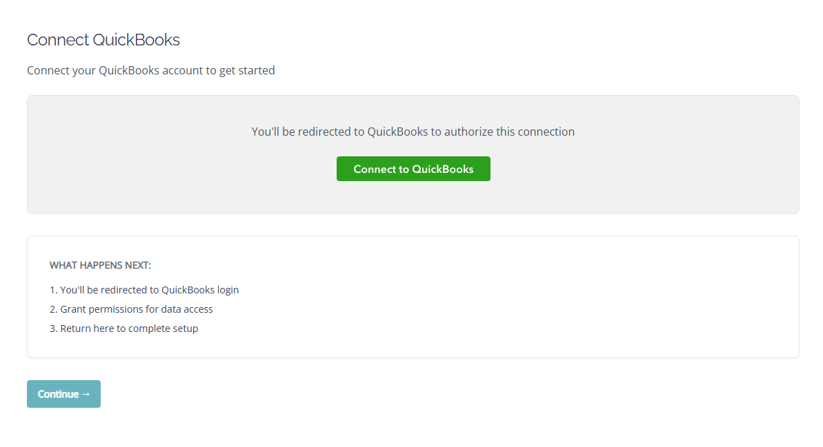 - Admin permissions: The user connecting must have admin or account owner access in QuickBooks.