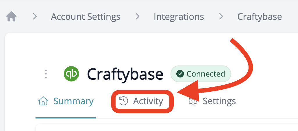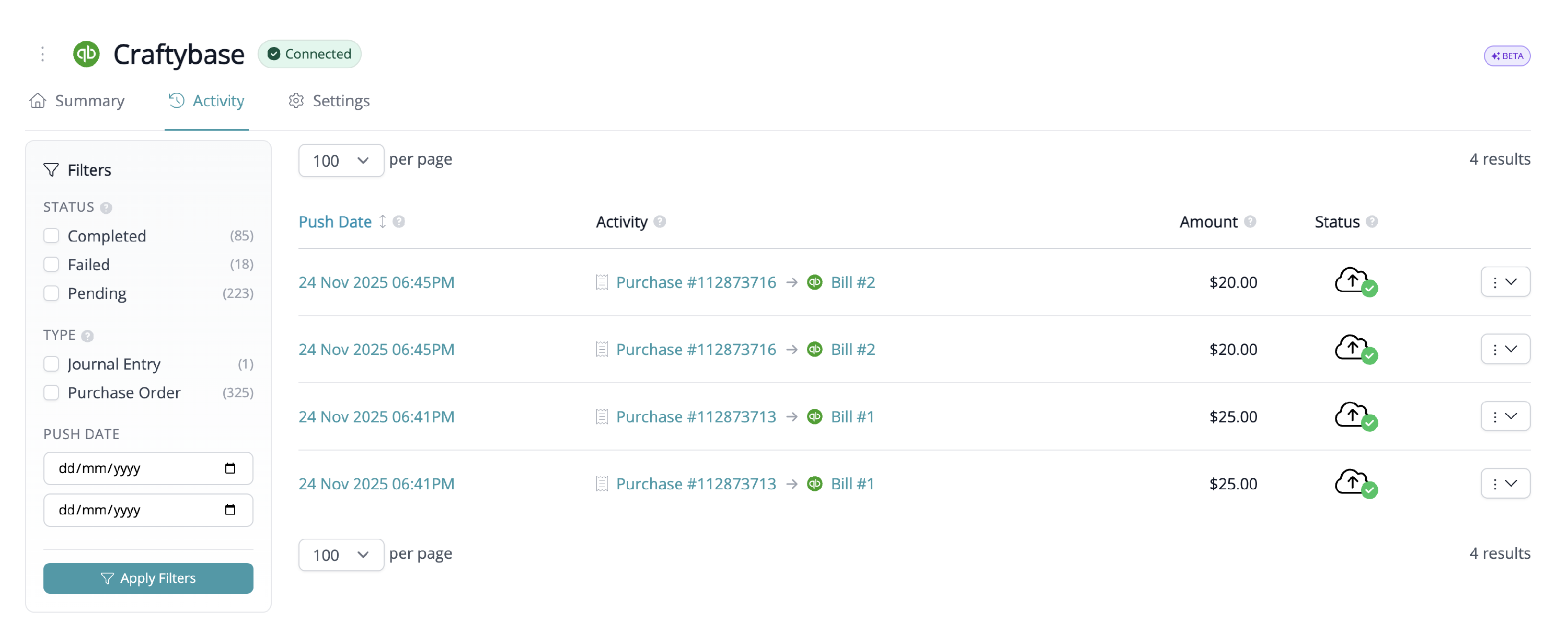 - Activity: Shows the source record in Craftybase and the destination document in QuickBooks
