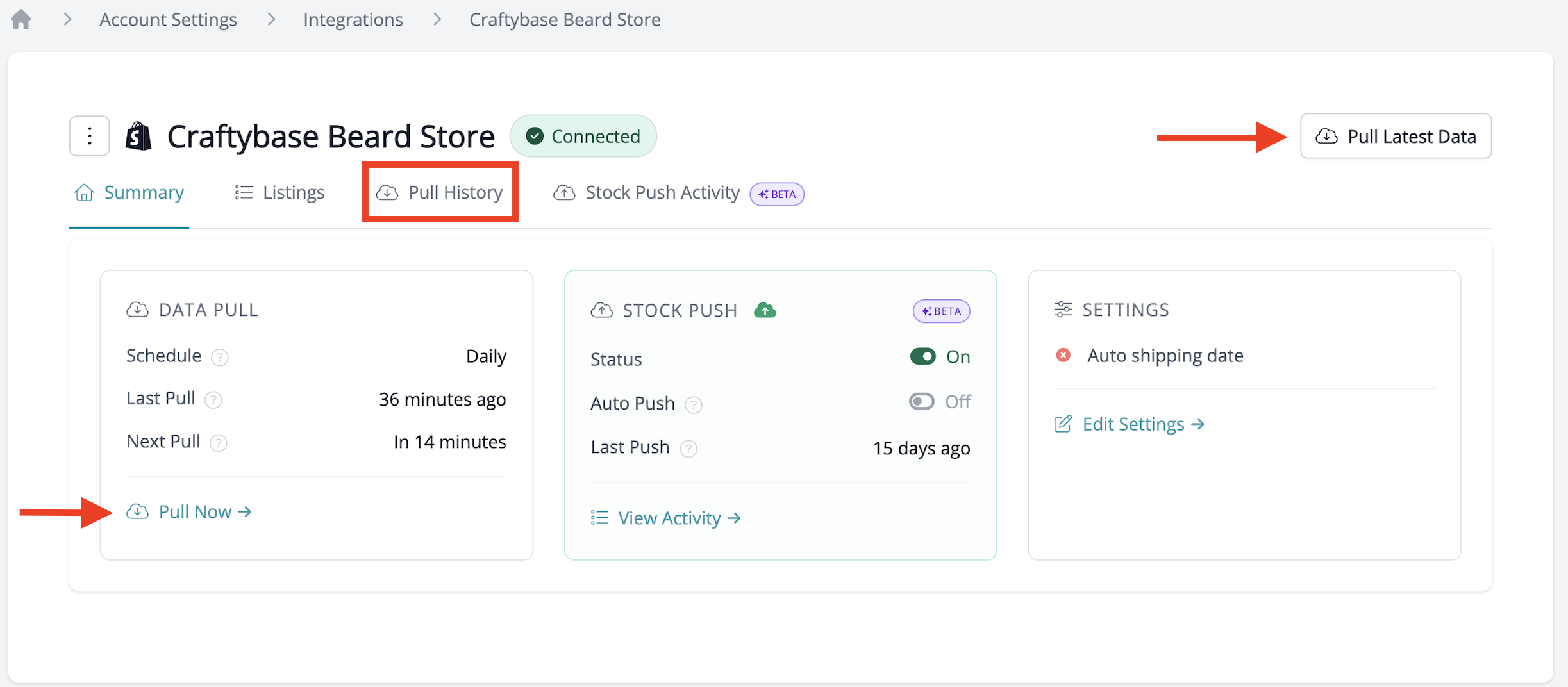 - Click on the "Pull Now →" option next to the store you would like to pull from manually.