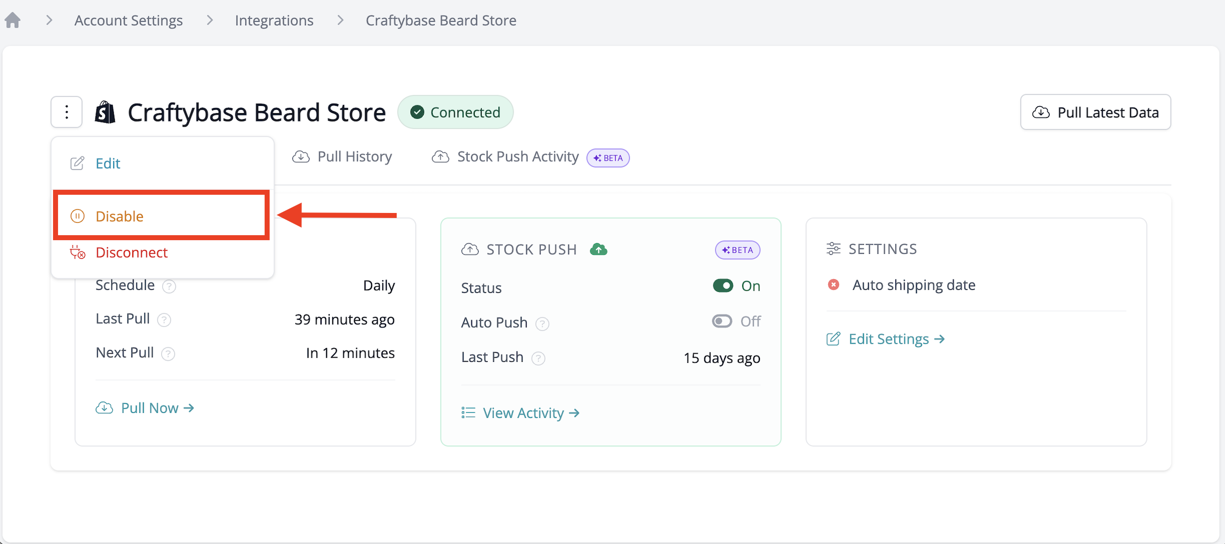 Once disabled, the shop will show a Paused status and will not pull any new data until it is re-enabled. You can re-enable the integration at any time.